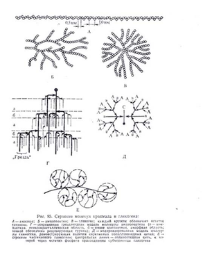 Природный крахмал состоит из двух различных фракций, отличающихся по своему строению и свойствам. Примерно 20% крахмала составляет амилоза (от греч. амилон–крахмал). Остальное приходится на вторую фракцию, получившую название амилопектина (от греч. пектос – студнеобразный). Такая терминология отражает некоторые свойства этих двух видов крахмала. Амилопектин с трудом растворяется в горячей воде, причём раствор получается вязкий (крахмальный клейстер) и при охлаждении застывает в студневидную массу. Амилоза же хорошо растворима в тёплой воде и не образует клейстера. Пользуясь этим обстоятельством, амилозу отделяют от амилопектина, многократно извлекая её тёплой водой. С этой же целью используют способность амилозы осаждаться под действием бутилового спирта при насыщении последним горячего раствора, содержащего смесь амилозы и амилопектина. Применяют и хроматографические методы. Например, после пропускания диспергированного крахмала через колонку с фосфатом кальция и последующего промывания фосфатным буфером амилоза элюируется, а амилопектин остаётся на сорбенте.