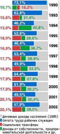 Существенно иную картину динамики доходов дает обобщение социологических исследований. В их процессе различные группы населения, представленные репрезентативно выбранными респондентами, оценивают изменение своих доходов значительно пессимистичнее, считая, что за период с 1990 по 2002 год они уменьшились в 3-4 раза.