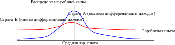 Образование и квалификация мигрантов. Обычно считается, что мигранты - это люди с низким уровнем образования и квалификации. Однако это предположение, как уже было сказано выше, не всегда верно. Дело в том, что низкоквалифицированные кадры действительно являются более мобильными, но предпочитают отправляться в те регионы, где уровень дифференциации доходов ниже. Напротив, высококвалифицированные работники склонны покидать страны, где проповедываются идеи равенства всех членов общества, и направляться в страны, где их высокопроизводительный труд оплачивается выше. Проиллюстрируем последнее утверждение графически: