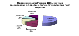 Неравенство между богатыми и бедными странами. Самой фундаментальной причиной миграции является неравенство доходов и возможностей в разных странах. Миграционные потоки обычно направлены из регионов с низкими заработными платами в более успешные с точки зрения уровня жизни и занятости регионы. И экономическая теория, и эмпирические исследования подтверждают тезис. Самый общий пример – движение рабочей силы из развивающихся стран в развитые. Можно также привести и ряд других примеров. Обратимся к данным о притоке рабочей силы в Россию (см. диаграмму 1) в 1996г.