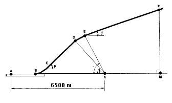 The aircraft begins the take-off roll at point A (Fig. 6.2), lifts off at point B, and initiates the first constant climb at point C at an angle β. The noise abatement thrust cutback is started at point D and completed at point E where the second constant climb is defined by the angle γ (usually expressed in terms of the gradient in percent). The end of the noise certification take-off flight path is represented by aircraft position F whose vertical projection on the flight track (extended centerline of the runway) is point M. The position of the aircraft must be recorded for the entire interval during which the measured aircraft noise level is within 10 dB of PNLTM. Position K is the take-off noise measuring station whose distance AK is specified as 6500 meters.