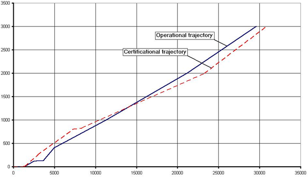In operational conditions the climb is performed without the cutback stage, and the aircraft flies over the control point at a lower altitude, which leads to higher noise levels.