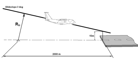 The approaches must be conducted with a steady glide angle of 3°±0.5° and must be continued to a normal touchdown with no airframe configuration change. Thus the distance from the control point to the glideslope RN remains constant and is equal to 119.7 m.