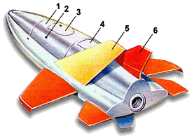 Условные обозначения: 1 - кабина космонавтов; 2 - иллюминаторы; 3 - входной люк; 4 - приборный отсек; 5 - консоли крыла при входе в плотные слои атмосферы; 6 - хвостовое оперение |