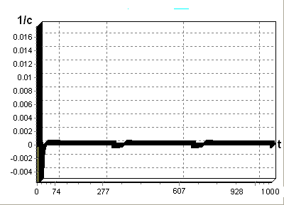 Результаты моделирования представлены в приложении В. Как показали результаты моделирования – минимальную погрешность оценивания показал 4-ый вариант наборов коэффициентов фильтра Льюинбергера. Как видно из результатов моделирование, наиболее длительный по времени переходной процесс показал 1-ый набор коэффициентов табл. 5.2 (~40 сек.), последующие наборы, показали тенденцию существенного снижения времени переходного процесса, так 3-ий набор коэффициентов фильтра Льюинбергера, показал (~8 сек.), вместе с тем, такая же тенденция наблюдается и с максимальной погрешностью оценивания. Так для 1-ого набора коэффициентов она составила (~0.01 1/с) , то для 4-ого набора коэффициентов максимальная погрешность оценивания составила (~0.0005 1/c). Следует отметить, что все четыре набора коэффициентов фильтра, были выбраны из области устойчивости рис. 4.2.1. 4-ый набор коэффициентов был найден методом интегральной квадратичной оценки качества, и является наиболее оптимальным, как показали результаты моделирования, для данных НУ взятых из табл. 5.1.