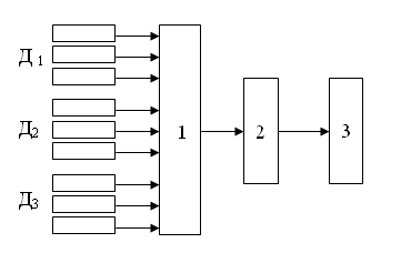 Типичная схема бесплатформенной системы управления космическим аппаратом показана на (рис 2.1). С бортовой цифровой вычислительной машиной 1 соединены три группы датчиков, условно обозначенных через Д1,