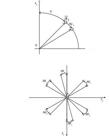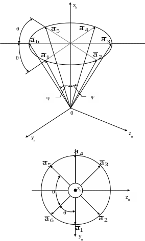 ) при номинальном положении располагаются параллельно ребрам базового правильного шестигранника, вписанного в конус вращения с углом полураствора , равным 0,9553 рад, и имеющего симметричное расположение ребер по кругу основания конуса с угловым шагом , равным 1,04 рад [21].