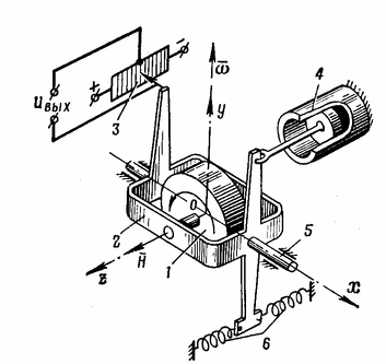 1 – ротор; 2 – рамка; 3 – датчик сигнала; 4 – демпфер; 5 – цапфа выходной оси; 6 – пружины; Н – кинетический момент гироскопа.