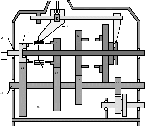 1- ведущий вал; 2- подшипники; 3и14- зубчатые колеса постоянного зацепления ведущего и промежуточного валов; 4- муфта включения третьей и четвертой передач;5и13-зубчатые колеса третьей передачи;6и12-зубчатые колеса второй передачи;7и11-зубчатые колеса первой передачи;8-Вилка включения ; 9- Ведомый вал;10- Блок зубчатых колес передачи заднего хода;15-Картер коробки передач.16-блок шестерен промежуточного вала.