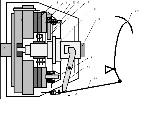 1.коленчатый вал.;2-маховик;3-ведомый диск с фрикционными нак-ладками;4-нажимной диск;5-картер сцепления;6-кожух сцепления;7-оттяжной рычаг;8-муфта выключения сцепления ;9-ведущий вал коробки передач; 10-педаль сцепления;11-тяга сцепления;12-вилка выключения сцепления;13-нажимная пружина;14-оттяжная пружина..