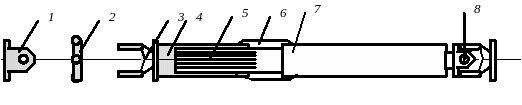 1и3-вилки;2-крестовина;4-шлицевая втулка;5-наконечник со шлицами;6-чехол;7-карданный вал;8-карданный шарнир.