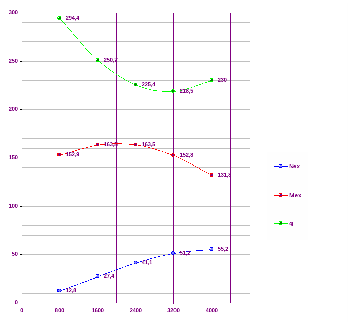 qe1 = 230 * [1,55 - 1,55 * 800 / 4000 + (800 /4000)2 ] = 294,4 (г/кВт*ч)