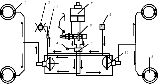 1 - передний тормозной механизм;2 - впускная труба; 3 - запорный клапан;4 - лампа сигнализатора;5 - сигнализатор неисправности гидропривода;6 - главный цилиндр; 7 - наполнительный бачок;8 - воздушный фильтр;9 - задний тормозной механизм;10 - задний гидровакуумный усилитель; 11 - передний гидровакуумный усилитель..
