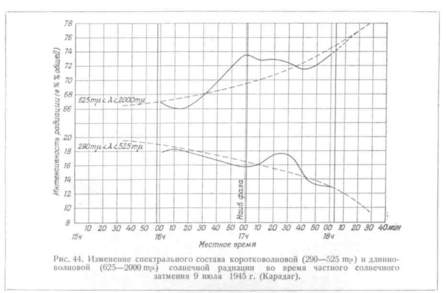 Как показывает график, наступление затмения действительно вызывает значительные изменения спектрального состава, которые не могут быть объяснены ни изменением высоты Солнца, ни влиянием облачности (это последнее при обработке наблюдений исключено путём сглаживания кривых хода радиации, подобно тому как это сделано на рис.1). Особенно обращает на себя внимание относительное увеличение интенсивности длинноволновой радиации, наблюдавшееся всё время, пока Луной было закрыто более 35% радиирующей площади солнечного диска и достигшее максимума во время наступления наибольшей фазы (которая для Карадага составляла 0,74). Представляет интерес также заметное повышение интенсивности коротковолновой радиации во второй половине затмения. Насколько общий характер имеют особенности изменения спектрального состава, обнаруживающиеся на рис.44, сказать пока трудно за отсутствием данных, обработанных подобным образом. Поэтому тщательно проведённые наблюдения над спектральным составом прямой солнечной радиации представляют большую ценность.
