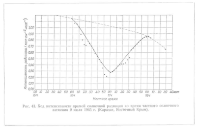 Отдельные точки на графике соответствуют результатам измерений. Сплошная кривая интерполирована по этим данным и представляет ход интенсивности радиации, каким он должен был бы получиться при отсутствии облаков. Пунктирная кривая представляет нормальный дневной ход радиации, который наблюдался бы без затмения. График наглядно показывает, что влияние затмения на интенсивность радиации может быть установлено со вполне удовлетворительной точностью, несмотря на искажения, внесённые влиянием облачности.