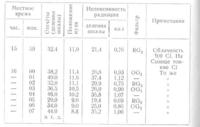 Отсчёты интенсивности рассеянной радиации во время затмения достаточно производить с промежутками в 2-3 минуты, начиная и заканчивая непрерывные отсчёты одновременно с отсчётами прямой солнечной радиации.
