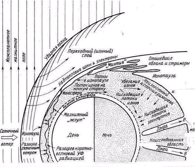Рис. Схема процессов в ионосфере и ее взаимодействия с солнечным ветром.