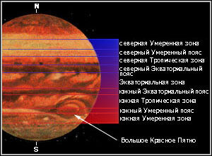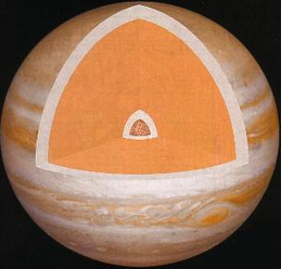 В самом центре, возможно, имеется маленькое ядро, состоящее из твёрдых пород и льда. Наличие источника внутренней энергии (тепло, выделившееся в результате гравитационного коллапса при образовании Юпитера) позволяет планете излучать в 1,5 – 2 раза больше тепла, чем она получает от Солнца. При визуальных наблюдениях диск Юпитера кажется пересечённым чередующимися светлыми зонами и тёмными поясами. Согласно данным, полученным четырьмя космическими зондами, пролетевшими мимо Юпитера в 1973 – 1981 гг. («Пионер-10 и -11», «Вояджер-1 и -2», и АМС «Галилео»), внутри этих полос наблюдается очень сложная система потоков. В каждом полушарии имеется пять или шесть таких полос, по направлению совпадающих с ветровыми течениями.