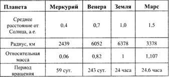 Объединенные в одну группу планеты: Меркурий, Венера, Земля, Марс, — хотя и близки по некоторым характеристикам, но все же каждая из них имеет свои неповторимые особенности. Некоторые характерные параметры планет земной группы представлены в табл. 1.