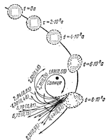 Рис. 1. Модель столкновения протосолнца с протозвездой. Орбиты захваченных сгустков характеризуются значениями большой полуоси (в единицах 10м см) и (в скобках) эксцентриситета. Буквой t обозначены моменты времени, выраженные в секундах.