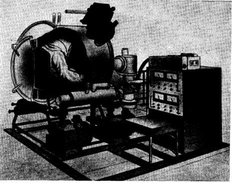 Все сказанное заставило на первоначальных этапах отказаться от работы в космическом скафандре непосредственно в вакууме. Было найдено компромиссное решение. Для проведения исследований по ручной сварке в условиях, максимально приближенных к космическим, Институтом электросварки им. Е. О. Патона в 1972 г. разработан специальный испытательный стенд 06-1469 (рис. 3).