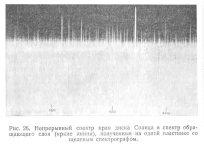 У 1905 р. за допомогою увігнутої дифракційної решітки були отримані прекрасні знімки спектру спалаху. Тоді ж вдалося одержати знімки спектру сонячного краю і звертає шару на одній і тій же платівці, повільно пересувається в напрямку, перпендикулярному до спектру (рис.26) f Вивчення цього матеріалу, що тривало кілька років, дало можливість визначити абсолютний вміст різних хімічних елементів у звертаємо шарі і число атомів різних газів над 1 кв. см фотосфери. У 1914 р.вже були отримані за допомогою діффракціонной решітки перші знімки спектру хромосфери поза затемненням, але по своїй науковій цінності вони значно поступаються знімкам під час затемнень. Поряд з успіхами спектральних досліджень в ці роки були досягнуті значні успіхи у вивченні будови сонячної корони і її зв'язки з іншими явищами, що відбуваються на Сонці. Провідна роль тут належить російським астрономам. Вже під час затемнення 19 серпня 1887, Смуга якого проходила по нашій країні, експедиції Московської обсерваторії в Юр'євці (А. А. Білопільський і П. К. Штернберг) вдалося отримати ряд знімків корони.Під час цього ж затемнення відбулося перше в історії науки спостереження повного сонячного затемнення з повітряної кулі, на якому піднявся наш знаменитий учений Д. І. Менделєєв.