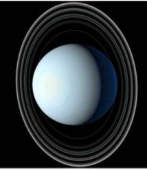 Далее идёт Уран. Уран тоже газовая планета, как Сатурн и Юпитер. У Урана более 10 спутников. Два самых больших и далёких - Оберон и Титания – увидел ещё Гершель, два следующих – Умбриэль и Ариэль – были открыты в XIX в., а Миранда – в XXв. Невероятно, но факт! Уран лежит на боку!