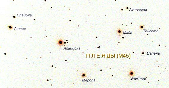 В Плеядах семь главных звезд, хотя на самом деле их гораздо больше в этом скоплении, но отлично видно в небе только семь. Индейцы знали о большом скоплении звёзд в созвездии, несмотря, на то что хорошо видно лишь семь из них, и они называли также Плеяды Кучей Солнц!