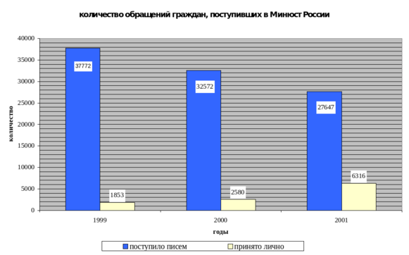 Особо следует сказать об организации личного приёма граждан. Личный приём делится на две категории - общий и специальный. Общий приём проводится в приёмной соответствующего органа особым сотрудником ежедневно. Специальный приём проводят должностные лица по предварительной записи. Личный приём, как общий, так и специальный, во всех изученных нами федеральных органах исполнительной власти организован приблизительно одинаково, различия в основном чисто технические, не имеющие значения для данного исследования. Общий приём проводится ежедневно в специальных помещениях. Жалобы, просьбы и т.п., изложенные гражданином в устной форме фиксируются в особой “карточке личного приёма”, которая затем проходит ту же процедуру рассмотрения, что и письменное обращение. Если гражданин на личном приёме подаёт письменное обращение, оно регистрируется специалистом, ведущим приём и затем также проходит общую процедуру. Поэтому личный приём, по большому счёту, никаких преимуществ не даёт, разве только заявитель менее зависим от работы почты - обращение регистрируется в его присутствии. Здесь весьма интересен пример Министерства юстиции РФ - там все обращения, поданные на личном приёме, ставятся на контроль, что на сегодняшний день является единственной более-менее весомой гарантией их своевременного и положительного разрешения (подробнее об этом ниже). Подобная практика существует и в Администрации Президента РФ, но в действующих там рекомендациях первоочерёдность рассмотрения и постановка на контроль обращений с личного приёма дополнена формулировкой “как правило”. Кстати сказать, это, видимо, действует на людей - в приёмную Минюста обращается всё больше людей, что видно на представленной диаграмме, в то время как в иных органах количество обратившихся в приёмную граждан стабильно.