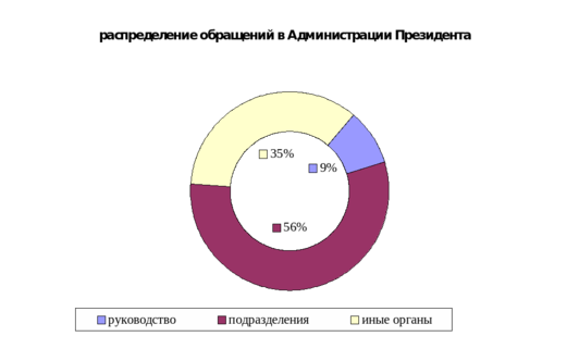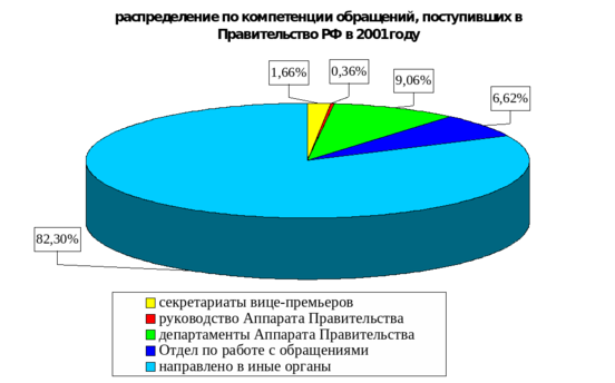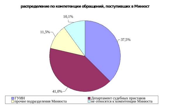 Рассмотрение обращений - “вершина” работы с обращениями. Рассмотрение как таковое осуществляется структурными подразделениями и должностными лицами в соответствии с их компетенцией. Распределение обращений граждан по компетенции также лежит на сотрудниках подразделения, работающего с обращениями. Если в Управлении Президента РФ по работе с обращениями граждан первичное рассмотрение обращения и дальнейшая передача для рассмотрения по компетенции осуществляются в отделе писем (в то время как регистрация - в другом), то и в Аппарате Правительства РФ, и в Министерстве юстиции РФ первичное рассмотрение осуществляет тот же сотрудник, что и принял обращение. Существенной проблемой здесь является распределение обращений по компетенции, по сути неотделимая от проблемы компетенции федеральных органов исполнительной власти вообще. И если с компетенцией министерств и ведомств, а также их структурных подразделений ещё как-то возможно разобраться (для удобства во всех подразделениях, работающих с обращениями граждан имеются специальные таблицы, где указаны сферы ответственности различных структурных подразделений), то с разграничением компетенции федеральных министерств и аналогичных по сферам ответственности подразделений Аппарата Правительства РФ и Администрации Президента РФ ничего не понятно. Поступающие в эти органы обращения распределяются сотрудниками отделов писем исходя опять-таки из “важности” и “весомости”: более “весомые” обращения направляются в структурные подразделения, менее “весомые” - в иные органы. Однако “весомость” устанавливается на основании весьма размытых критериев, нигде документально не зафиксированных. Так, в Аппарате Правительства РФ в департаменты Аппарата направляются обращения, имеющие “фундаментальный характер” (например, предложения по совершенствованию налоговой системы) либо те, в которых обжалуются действия федеральных министерств и ведомств. “Особо важные” обращения направляются для ознакомления руководителям соответствующих департаментов, и при их согласии передаются в секретариаты Председателя Правительства или его Заместителей для доклада. В Министерстве юстиции РФ с распределением обращений по компетенции проще - явно не относящиеся к компетенции Министерства пересылаются в иные органы власти, прочие распределяются по структурным подразделениям Министерства. Обращения, имеющие “особое значение” (чётких критериев опять-таки нет) докладываются Руководителю департамента делопроизводства и он докладывает их одному из Заместителей Министра или (по согласованию с аппаратом министра) самому Министру. Как обыкновенно распределяются на рассмотрение обращение граждан в рассматриваемых нами структурах, видно на представленных диаграммах.