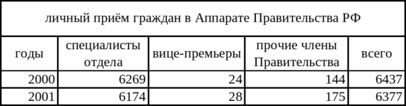Что касается специального приёма, то он проходит в две стадии. На первой стадии обращение принимается от гражданина на общем приёме и затем, если обращение сочтут важным и весомым, заявителя запишут на приём к должностному лицу, ответственного за разрешение его проблемы. Здесь важно отметить, что решение об этом принимает специалист, ведущий приём, т.е. чиновник очень невысокого ранга. Только на приём к высшим должностным лицам (Руководителю Администрации Президента РФ, его заместителям, Заместителям Председателя Правительства РФ) можно попасть после дополнительных согласований с начальником подразделения по работе с обращениями и секретариатом соответствующего должностного лица. При этом каких-либо нормативно закреплённых критериев “важности” и “весомости” проблем не существует (подобные критерии, оформленные в виде методических рекомендаций для специалистов приёмной есть в Администрации Президента РФ51, но ознакомиться с ними автору не удалось). Приём проводится должностными лицами по заранее утверждённому графику, который готовят совместно подразделения по работе с обращениями граждан и секретариаты (или помощники) этих должностных лиц. В Администрации Президента РФ приём ведут Руководитель Администрации, его заместители, руководители структурных подразделений; в Аппарате Правительства РФ - федеральные министры и Заместители Председателя Правительства; в Министерстве юстиции РФ - заместители министра и руководители структурных подразделений. Кстати, попасть на приём к Министру юстиции через приёмную министерства практически невозможно, но через приёмную Правительства не так сложно (он принимает граждан как член Правительства не реже 2 раз в год). Высшие руководители страны - Президент и Председатель Правительства приёма граждан не ведут. Хотя были случаи, когда Президент принимал граждан в своём кремлёвском кабинете, но они носили эпизодический характер и никак не были регламентированы. В целом приём граждан высшими должностными лицами ведётся достаточно активно, что видно из представленной таблицы.