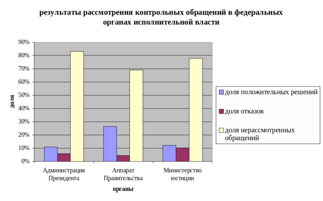 Вместе с тем очевидно, что существующие нормы, регламентирующие рассмотрение обращений безнадёжно устарели. Это ярко демонстрирует практика федеральных органов исполнительной власти в области работы с обращениями граждан. Очевидно, что разобщённость подразделений федеральных органов исполнительной власти, работающих с обращениями, многочисленные затруднения технического плана и, опять-таки, отсутствие единой нормативной базы, создаёт практически непреодолимые препятствия в их работе. Несмотря на большие, подчас героические усилия работников этих подразделений, очень высокой остаётся доля никак не разрешённых, “висячих” обращений, хотя число положительно решённых обращений с годами растёт, а доля отказов снижается (см. диаграмму на стр.75).