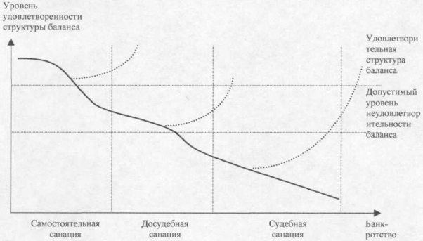 пунктирной линией обозначено изменение уровня удовлетворительности структуры баланса для положительных результатов санации; уровень удовлетворительности структуры баланса — интегрированный показатель, разработанный с учетом ликвидности, обеспеченности собственными средствами, возможности восстановить платежеспособность