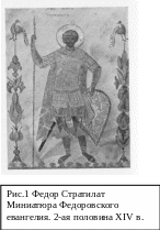 Художественная жизнь Ярославля, как и Ростова Великого, не замирала, однако, даже во времена татаро-монгольского ига. Об этом свидетельствуют произведения иконописи и миниатюры, сохранившиеся до наших дней. Крупнейшим центром культуры и искусства оставался Спасский монастырь. Его великолепное рукописное Федоровское евангелие (2-я пол. XIV в., Ярославский историко-архитектурный музей-заповедник), очевидно, вклад ростовского епископа Прохора, выходца из Спасского монастыря, свидетельствует об утонченном художественном вкусе местных феодальных кругов, о сохранении здесь лучших традиций домонгольского наследия. Украшенная изящными цветными заставками и инициалами, рукопись имеет две роскошные миниатюры, изображающие: одна - воина Федора Стратилата, другая - Иоанна, диктующего Прохору, обе с характерным тонким узорочьем красочного орнамента. Федор Стратилат, патрон умершего в начале XIV в. ярославского князя Федора Черного, одет в парадную воинскую одежду и правой рукой опирается на длинное копье. За его спиной на поясе висит меч, в левой руке – щит с изображением барса, родового знака владимиро-суздальских князей (рис.1)