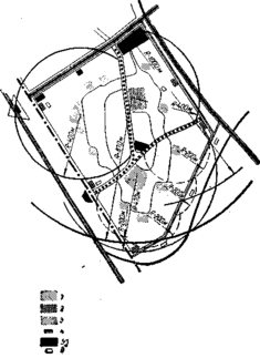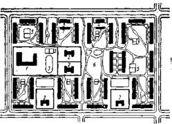 | План жилого района в городе 1 – школы; 2 – детские учреждения; 3 – магазины, столовые и предприятия бытового обслуживания; 4 – домоуправление; 5 – гаражи; 6 – кинотеатр; 7 – центр жилого района | |