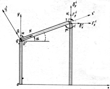 ассмотрим плоскую раму каркаса промышленного здания, стойки которой жестко защемлены в фундаментах, а ригели жестко прикреплены к стойкам. Ограничим рассмотрение случаем, когда на раму действует только узловая нагрузка. Пронумеруем узлы – точки пересечения осей стержней друг с другом и “землей”. В каждом узле i рамы на нее могут действовать сосредоточенные силы Fx, Fy и момент М, заданные в некоторой глобальной системе координат, связанной с рамой.