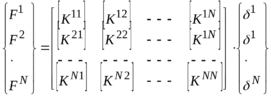 где суммирование распространяется на все стержни, соединяющиеся с узлом i. Полная система уравнений равновесия для стержневой системы с N узлами в матричной форме примет вид: