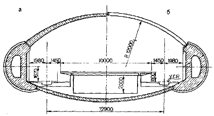 Котлован между тоннелями разрабатывают вдоль оси станции захватками по 20-30 м. На этих участках по мере углублен котлована демонтируют тюбинги временного заполнения кольца, в створе с которым будут расположены жесткие замкнутые рамы. Дойдя до отметки лотка станции, бетонируется обратный свод. Затем поперек станции устанавливают жесткие замкнутые рамы так, чтобы консольные части ригелей зашли в прорези, образовавшиеся при демонтаже колец, под балки-перемычки. Стыки элементов рам омоноличивают. По рамам укладывают плиты перекрытия и производят обратную засыпку. Только после обратной засыпки демонтируют оставленные между рамами тюбинги временного заполнения обделки путевых тоннелей. Новые возможности для выбора оптимальных конструктивных и технологических решений при полузакрытом способе сооружения станции открываются при использовании конструктивной схемы односводчатой станции, обделка которой представляет собой пологие верхний и обратный своды, опирающиеся на массивные опоры кругового очертания. В определенных условиях обратный свод может быть заменен лотковой плитой. Полые опоры свода выполнены из монолитного бетона в тоннелях, пройденных перегонными щитовыми комплексами. На рис. 2.7 представлены варианты такой конструкции с монолитным (а) и сборным (б) исполнением верхнего свода.