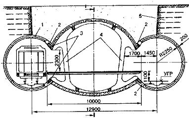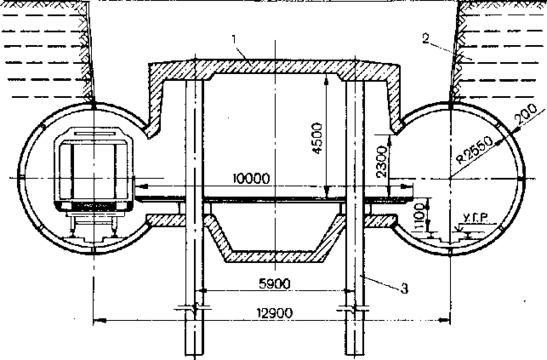1 — путевые тоннели; 2 — замковые элементы обделки; 3 — отметка, соответствующая низу перекрытия станции; 4 — сваи-колонны;