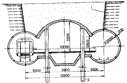 Примером иного конструктивного решения станции, которое позволяет сохранить принцип поточной технологии работ, основанной на транзитной проходке перегонных тоннелей, может служить полносборная железобетонная станция распорно-рамными конструкциями (рис. 2.6).