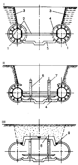 Так, при необходимости быстро восстановить проезжую часть над станцией в условиях интенсивного транспортного потока, целесообразна организация работ по схеме, показанной рис. 2.8,6. После бетонирования опор котлованы разрабатывает только до уровня опорных тоннелей, демонтируют верхнюю час их обделки, сооружают свод и производят обратную засыпку восстанавливая движение городского транспорта над строящейся станцией. Затем под прикрытием свода ведут разработку грунта в сечении станции, устраивают обратный свод и монтируют платформу. Выдачу грунта, доставку материалов и элементов конструкций производят через поперечные траншеи в торце станции, которые были разработаны ранее.