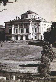 парком. Далеко виден его купол поднятый на лёгкой колоннаде. А вокруг кудрявятся клёны , высятся тополя , дубы , клонятся гибкие ивы , и то там , то здесь видны светлые очертания павильонов парка . Их размещение , так же как планировка парка , тесно связаны с дворцом . Первоначально от центрального корпуса дворца , решенного архитектором в виде куба , отходили лёгкие крылья открытых галерей. Широко распахнутые в сторону дворца , они заканчивались небольшими служебными флигелями.