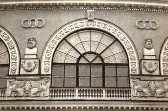 Полуциркульная застеклённая стена её выходит Собственный садик и соединяется с остальной частью помещения аркой , украшенной кариатидами работы В. И.