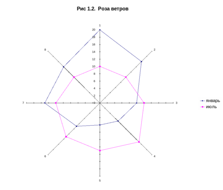 Для рассматриваемого района зимой преобладают ветры северного и западного направлений. Летом преобладают ветры южного и юго-восточного направлений (рис 1.2). Средняя скорость ветра за январь равна 3,22 м/с. Максимум из средних скоростей по румбам за январь — 6,8 м/с. Средняя скорость ветра за июль равна 3,55 м/с. Максимум из средних скоростей по румбам за июль — 4,4 м/с.