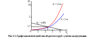 По данным гидравлических характеристик типовых труб (табл. IV [2] стр. 26) строят график пропускной способности Qтр = f∙(H) трубы данного отверстия и режима протекания и график Qс = f∙(H) по данным таблицы 2.1. Искомый расчетный сбросной расход с учетом аккумуляции Qс и величина подпора H соответствуют точке пересечения двух графиков Qс и Qтр.