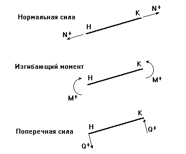 для нагрузок, действующих на стержни: если повернуть плоскость чертежа так, чтобы начало стержня была слева, а конец стержня - справа, то положительное направление нагрузок для типов 4 и 5 - сверху вниз.