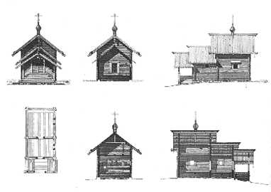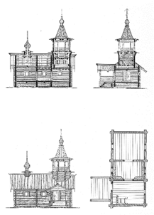 При всей однотипности кижских часовен диапазон их архитектурно-композиционных различий широк. В одной из них западный придел подобен небольшому тамбуру, как в Подъельниках, в другой, напротив, он развит до масштаба трапезной, намного превышающей площадь самой часовни, как сделано в Васильеве. В этой часовне колокольня имеет второстепенный характер, а в Кавгоре или в Усть-Яндоме она перерастает в основную архитектурную форму здания, подчиняя себе всю его композицию и определяя его художественный образ.