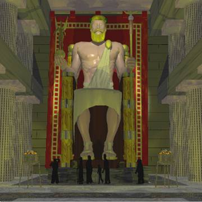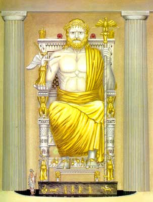татуя Зевса находилась в храме, длина которого достигала 64 метров, ширина - 28, а высота внутреннего помещения была около 20 метров. Сидящий в конце зала на троне Зевс подпирал головой потолок. Обнаженный до пояса Зевс был изготовлен из дерева. Тело его покрывали пластины розоватой, теплой слоновой кости, одежду - золотые листы, в одной руке он держал золотую статую Ники - богини победы, другой опирался на высокий жезл. Зев был столь величествен, что, когда Фидий завершил свой труд, он подошел к статуе, как бы плывущей над черным мраморным полом храма, и спросил: “Ты доволен, Зевс?” В ответ раздался удар грома, и пол у ног статуи треснул. Зевс был доволен.