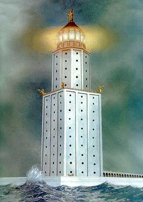 Гавань Александрии, пожалуй самая деловитая и оживленная во всем мире, была неудобной. Нил несет массу ила, на мелководье среди камней и мелей требуются умелые лоцманы. Чтобы обезопасить мореплавание, решено было построить маяк на острове Фарос, на подходе к Александрии. В 285 году до нашей эры остров соединили с материком дамбой, и архитектор Сострат Книдский приступил к работам. Строительство заняло всего пять лет: Александрия была передовым техническим центром и самым богатым города тогдашнего мира, к услугам строителей были громадный флот, каменоломни и достижения мусейонских академиков. Маяк получился в виде трехэтажной башни высотой 120 метров (первый и самый опасный “соперник” египетским пирамидам). В основании он был квадратом со стороной тридцать метров, первый шестидесятиметровый этаж башни был сложен из каменных плит и поддерживал сорокаметровую восьмигранную башню, облицованную белым мрамором. На третьем этаже, в круглой, обнесенной колоннами башне, вечно горел громадный костер, отражавшийся сложной системой зеркал . Дрова для костра доставлялись наверх по спиральной лестнице, такой пологой и широкой, что по ней на стометровую высоту въезжали повозки, запряженные ослами.