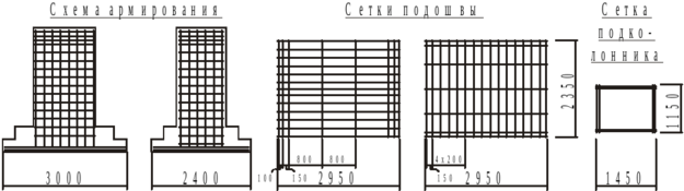 Считаем, что фундамент Ф1 армируется двумя горизонтальными сетками (подошва) и вертикальной закольцованной сетки, выполненной из четырех отдельных вертикальных сеток (подколонник, см рис. 4).